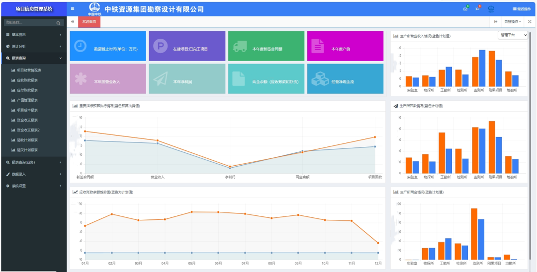 勘察設(shè)計(jì)公司投入運(yùn)行的項(xiàng)目信息管理平臺(tái)聚焦各項(xiàng)目管理和項(xiàng)目分布特點(diǎn),以項(xiàng)目編碼為主標(biāo)識(shí),通過(guò)首頁(yè)關(guān)鍵生產(chǎn)指標(biāo)、報(bào)表查詢(xún)、綜合查詢(xún)?nèi)髷?shù)據(jù)展示模塊,實(shí)現(xiàn)項(xiàng)目全生命周期信息管理。并在平臺(tái)內(nèi)部設(shè)置了項(xiàng)目毛利預(yù)警監(jiān)測(cè)提示,實(shí)現(xiàn)項(xiàng)目管理全過(guò)程監(jiān)督。與此同時(shí),該項(xiàng)目信息管理平臺(tái)具有數(shù)據(jù)導(dǎo)入快捷、數(shù)據(jù)批量處理等特點(diǎn),大大提高項(xiàng)目信息處理效率,為后續(xù)實(shí)現(xiàn)項(xiàng)目智能化管理奠定了基礎(chǔ)。